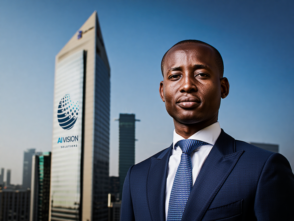 First upload your company logo: “Create a photorealistic, cinematic and high-resolution portrait of a confident entrepreneur in South Africa standing in front of a city skyline under the blue African sky with the attached logo clearly and boldly showing on one of the prominent buildings nearest the entrepreneur. The entrepreneur is happy and motivated.”